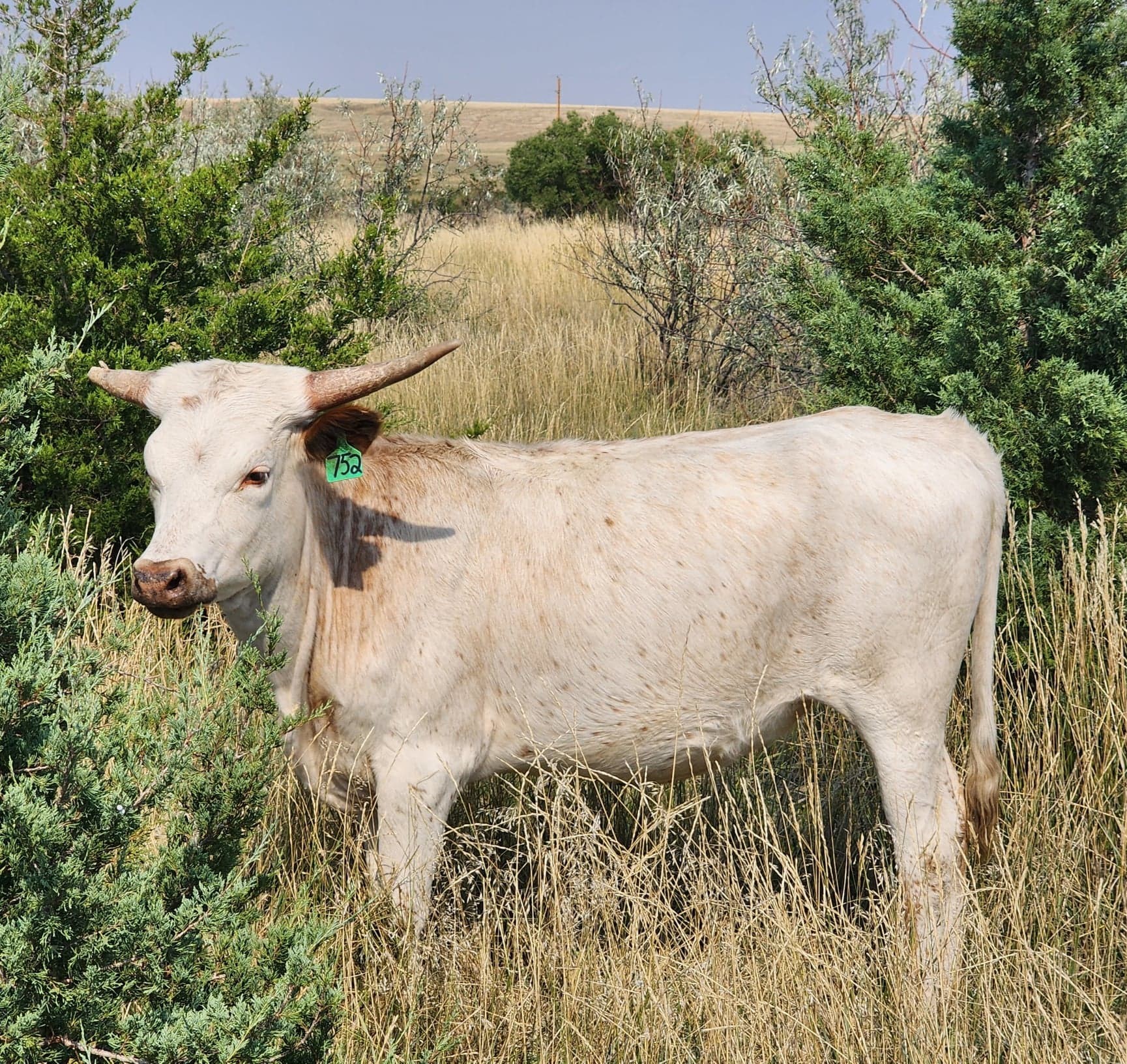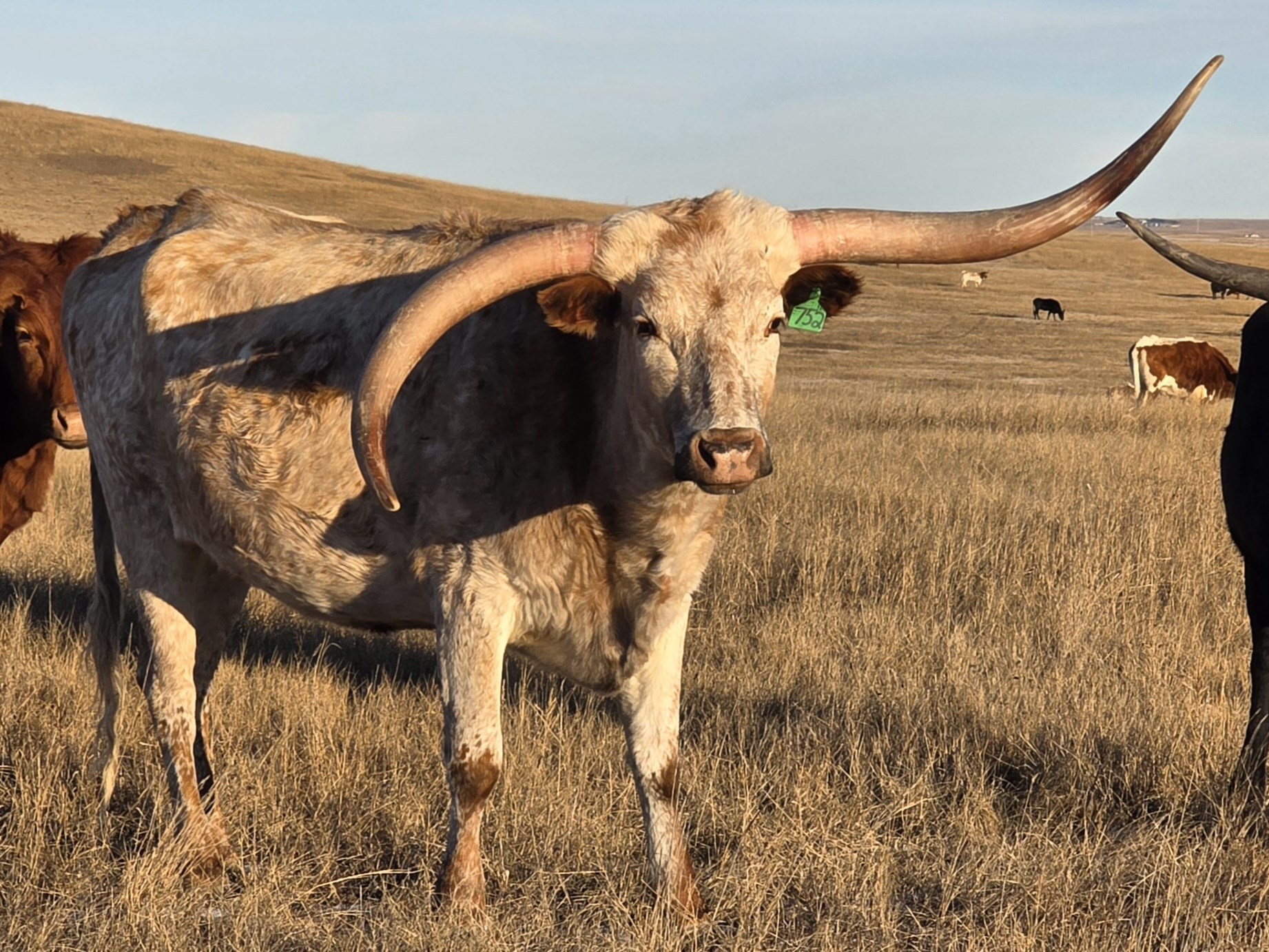 New picture coming soon (you will be impressed). South Dakota winters can be brutal. It took a toll on this girls right horn tip, but her horn genetics were kept warm and secure! Embryo heifer by MC Hangin Tuff (100.25' ttt) and EZTs Wallflower (104.5" th) provide the credentials to make this girl an heir to greatness!! If her right blinker bothers you, we will keep her and enjoy the powerful calves she plans to produce!